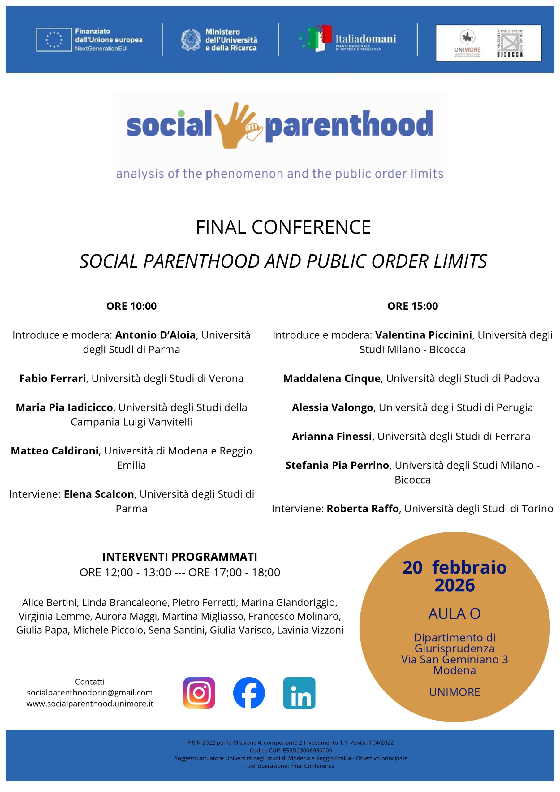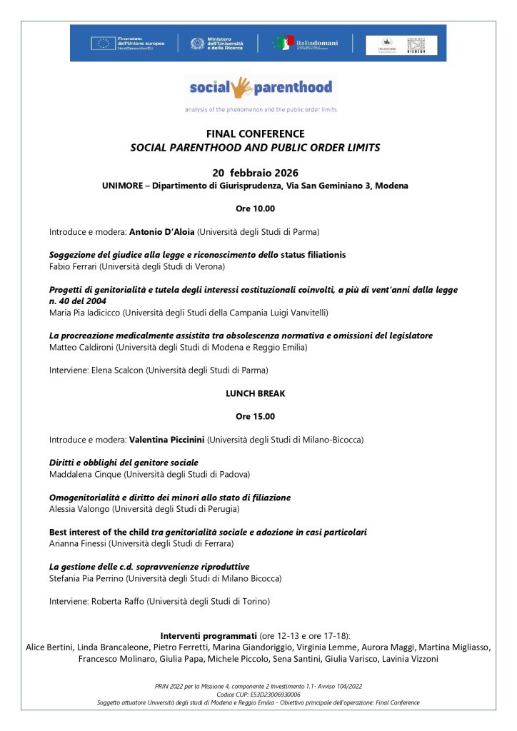 The PRIN 2022 research project “Social Parenthood: Analysis of the Phenomenon and the Public Order Limits” will conclude with its Final Conference, to be held on 20 February 2026 at the Department of Law of the University of Modena and Reggio Emilia.